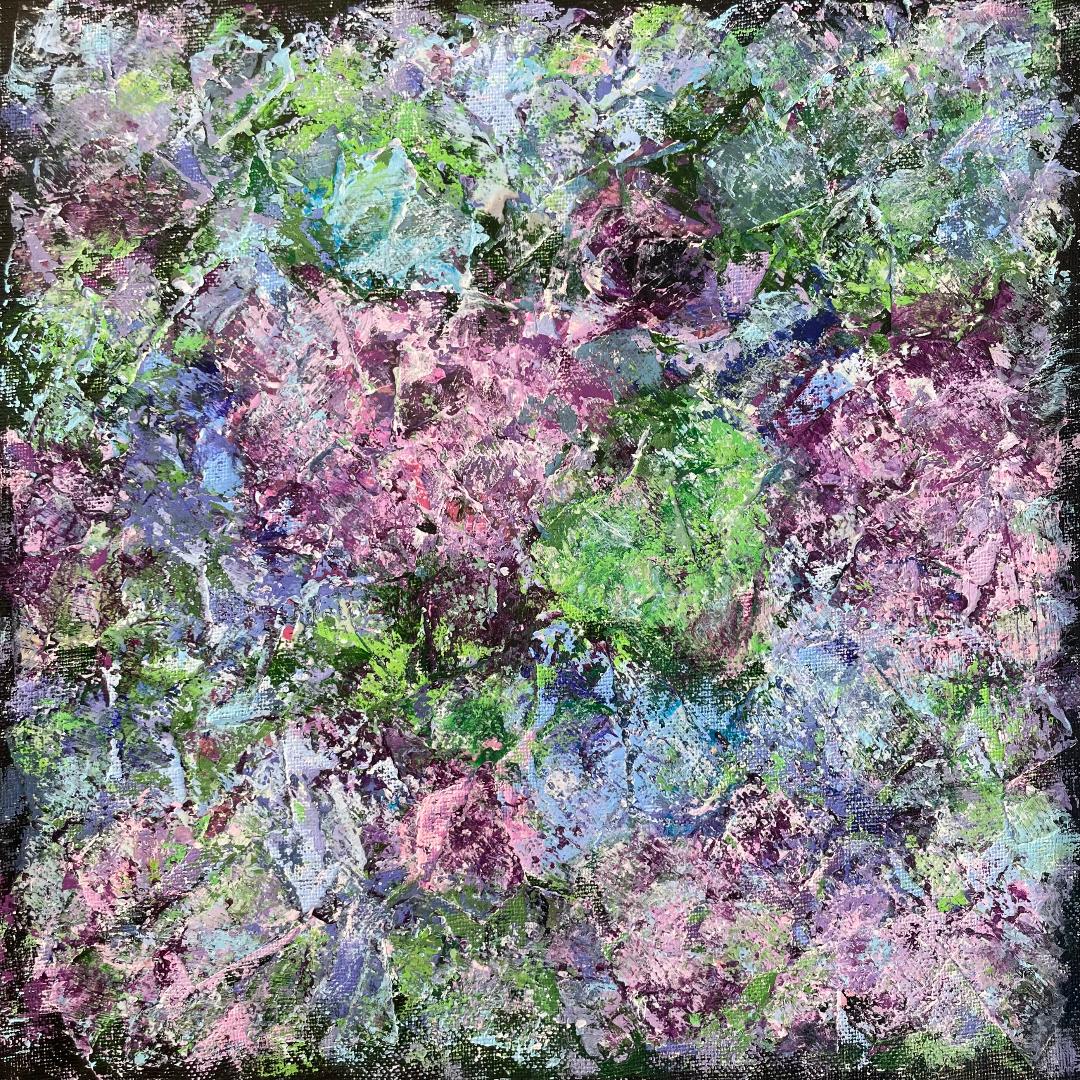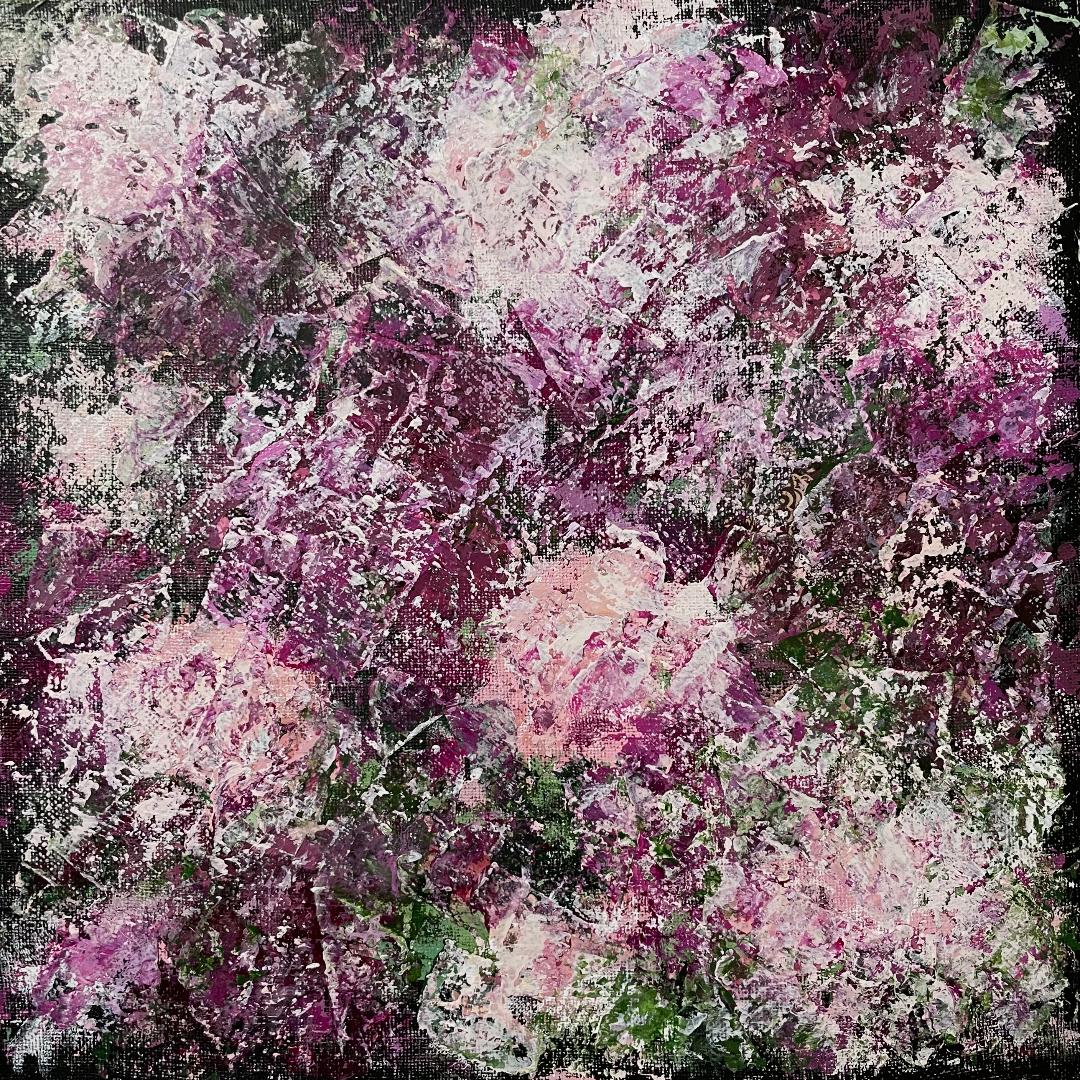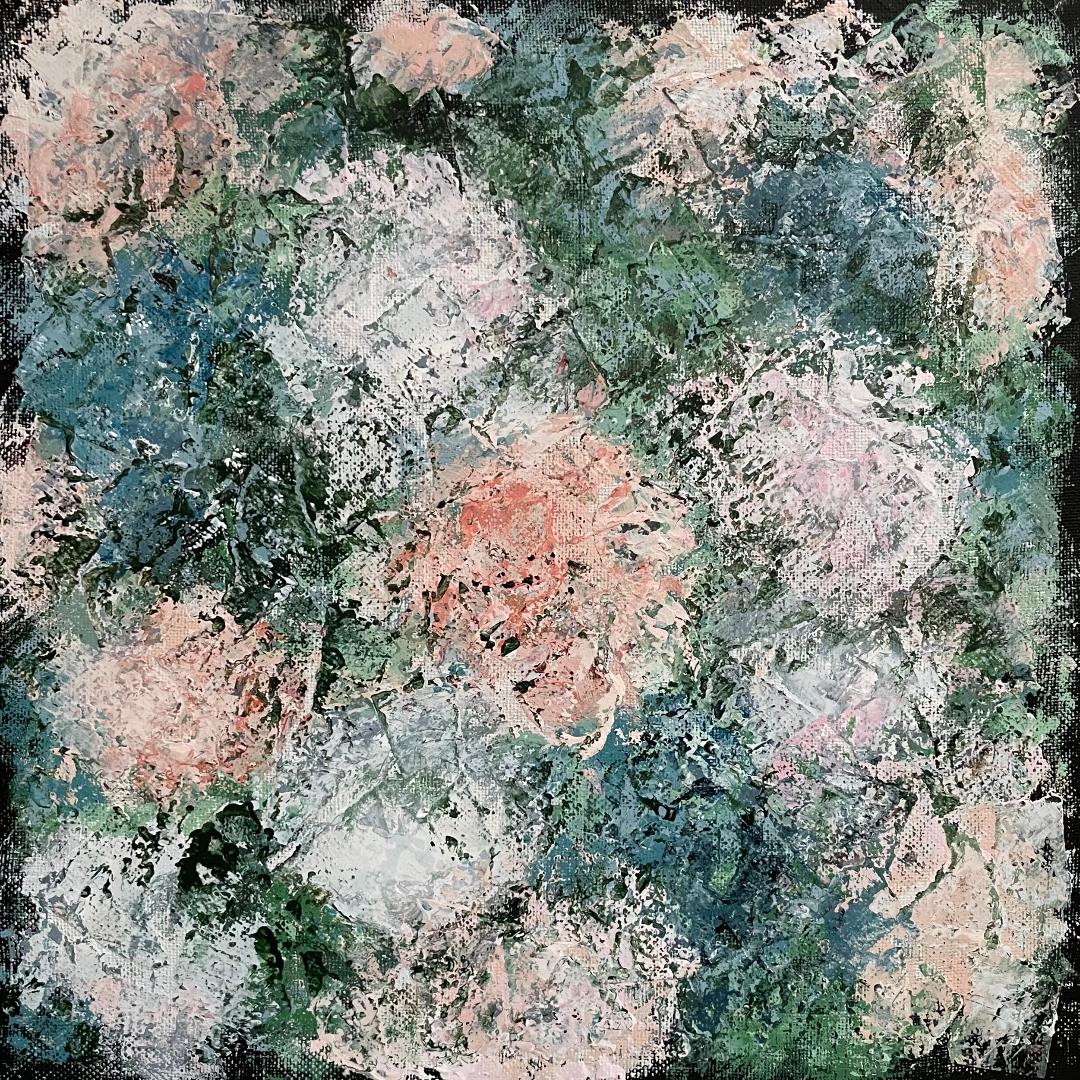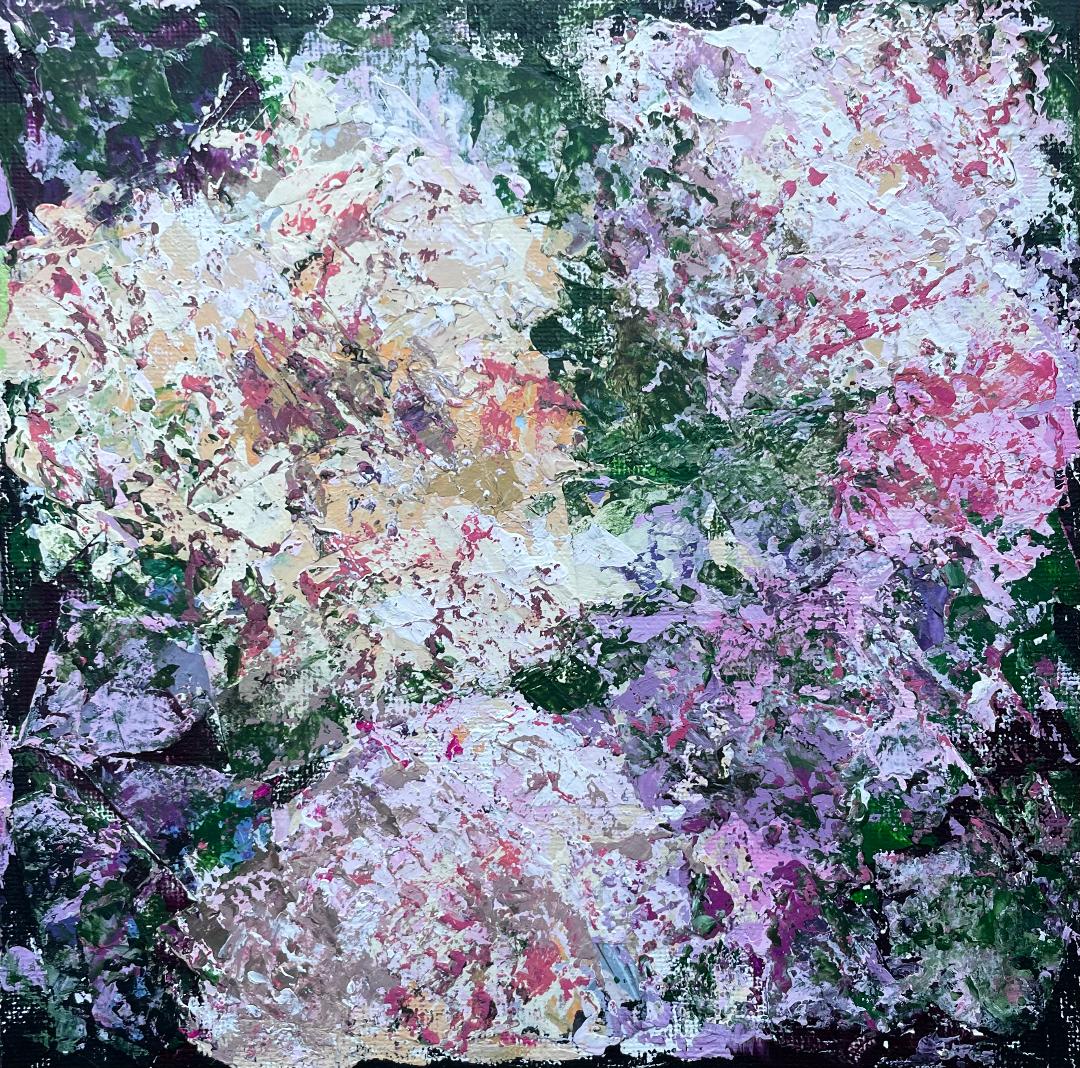 The Beautiful Blooms exhibition showcases Lynne's vibrantly fragmented floral paintings in collage and acrylic paint.