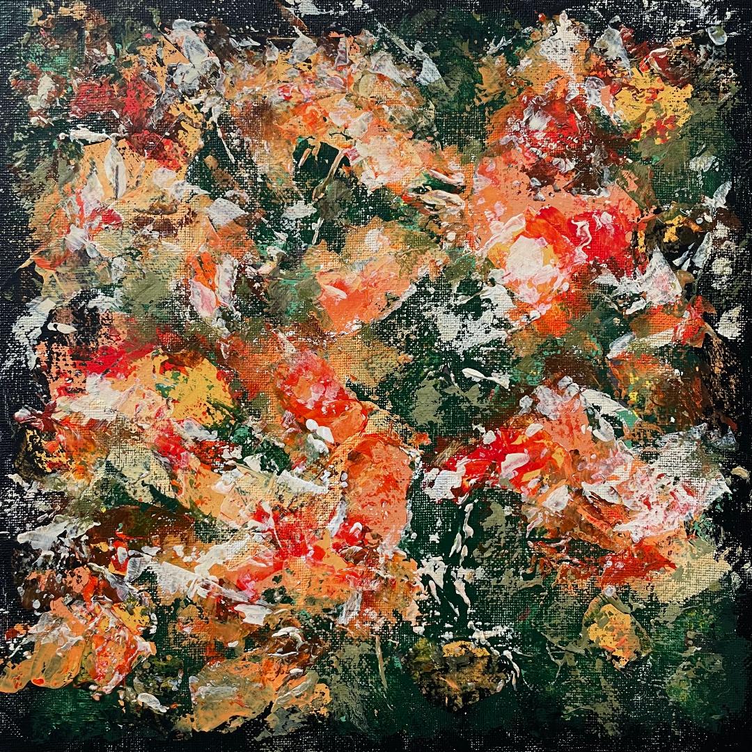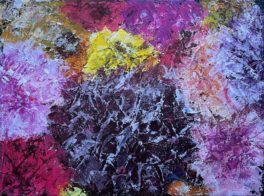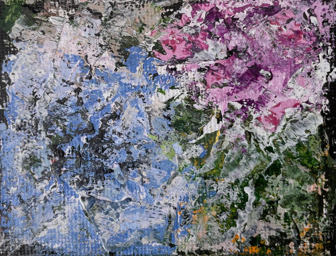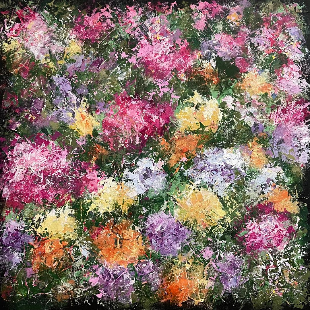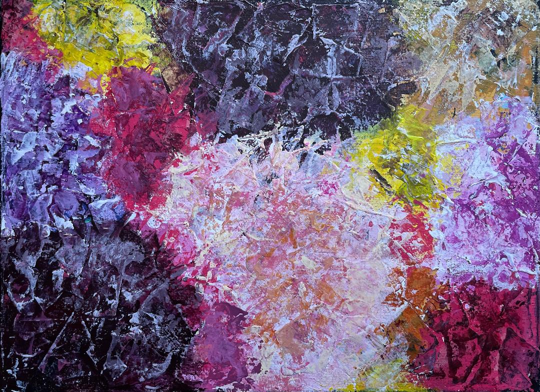 The Beautiful Blooms exhibition showcases Lynne's vibrantly fragmented floral paintings in collage and acrylic paint.